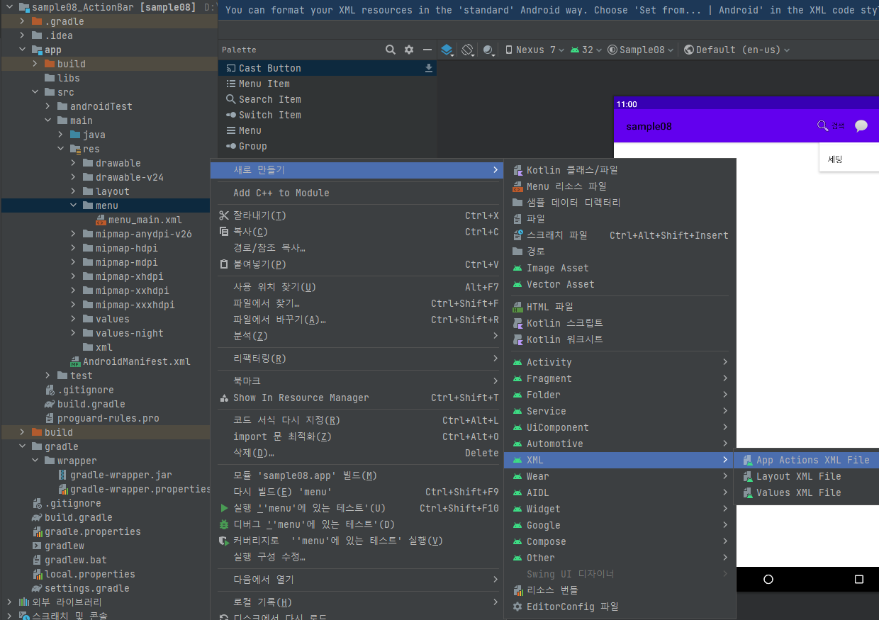 2. res폴더 내에 생성한 menu폴더에 새로만들기 - XML - App Actions XML File -> menu_main.xml 생성