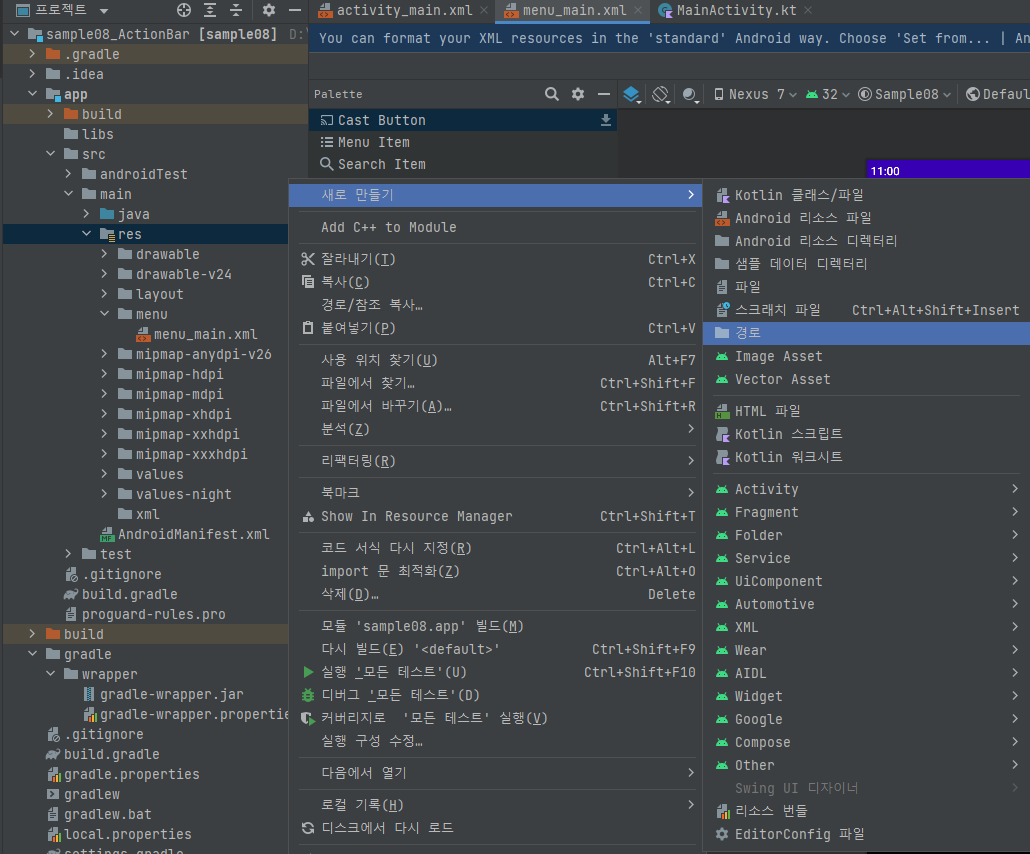 1. app - src - res -> 새로만들기 - 경로 - menu 생성